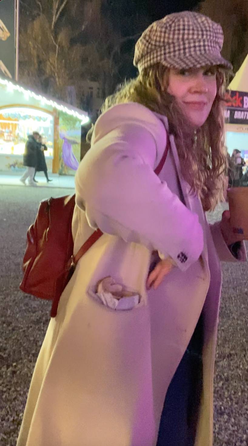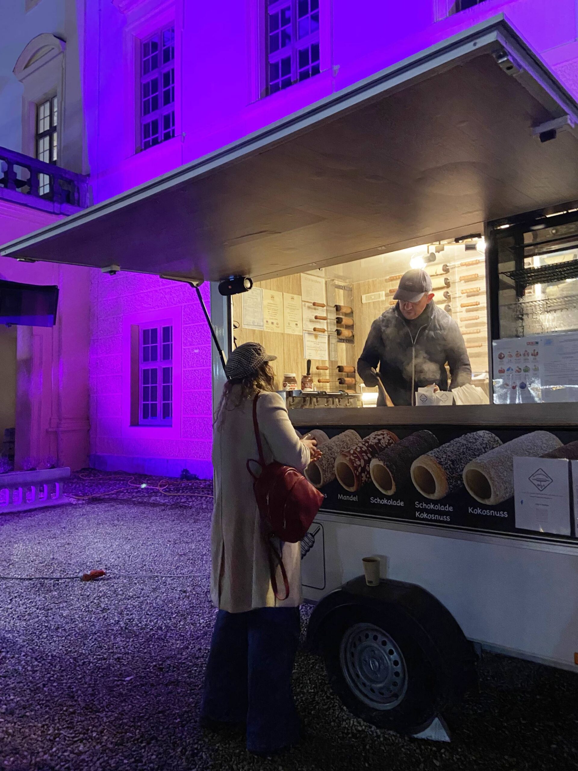 Dazu gab’s für uns Baumstriezel, frisch gedreht, warm und zimtig und perfekt für große „Mantel“-Taschen. An einer knisternden Feuerstelle nebenan haben wir dann die Leckereien genossen. Das sind die kleinen Details, die einen Weihnachtsmarkt besonders machen.